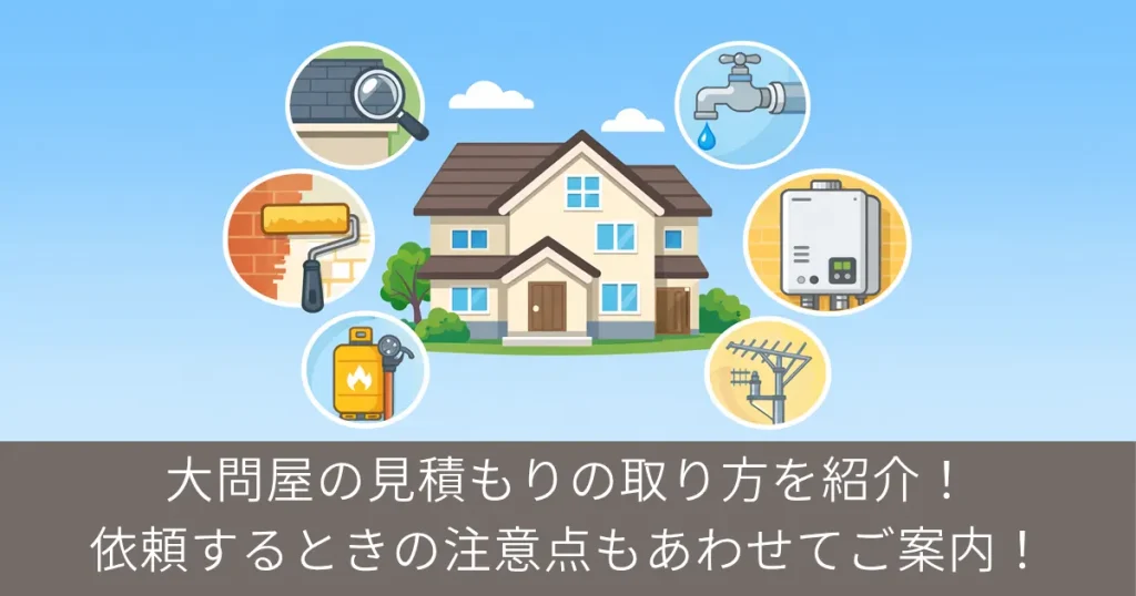 この記事では、大問屋の見積もりの取り方についてまとめています。 大問屋の見積もりは、大問屋に問い合わせて必要な情報を伝え、現地調査のあとに内訳付きの見積書を受け取り、その内容と保証を確認してから依頼する流れです。 すぐに大問屋を試してみた... 未分類